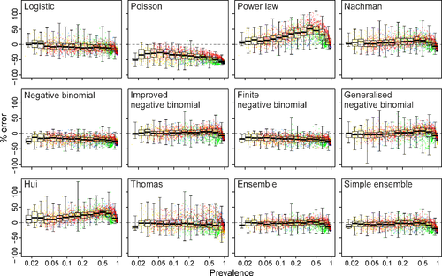 Figure 1: Comparison of downscaling performance of difference mathematical models with the percentage error from the known distribution of breeding birds of Flanders. Points above the zero line are overestimates of occupancy and under the line are underestimates. The x-axis is the prevalence of the species in Flanders.